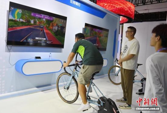 2023年8月24日,吉林長春,市民體驗(yàn)比特騎行,感受數(shù)智競技運(yùn)動(dòng)的樂趣。第十四屆中國—東北亞博覽會(huì)首次設(shè)置現(xiàn)代裝備與新能源合作主題館,集中展示人工智能平臺(tái)、新能源智能轎跑、制氫整流電源等裝備和產(chǎn)品。